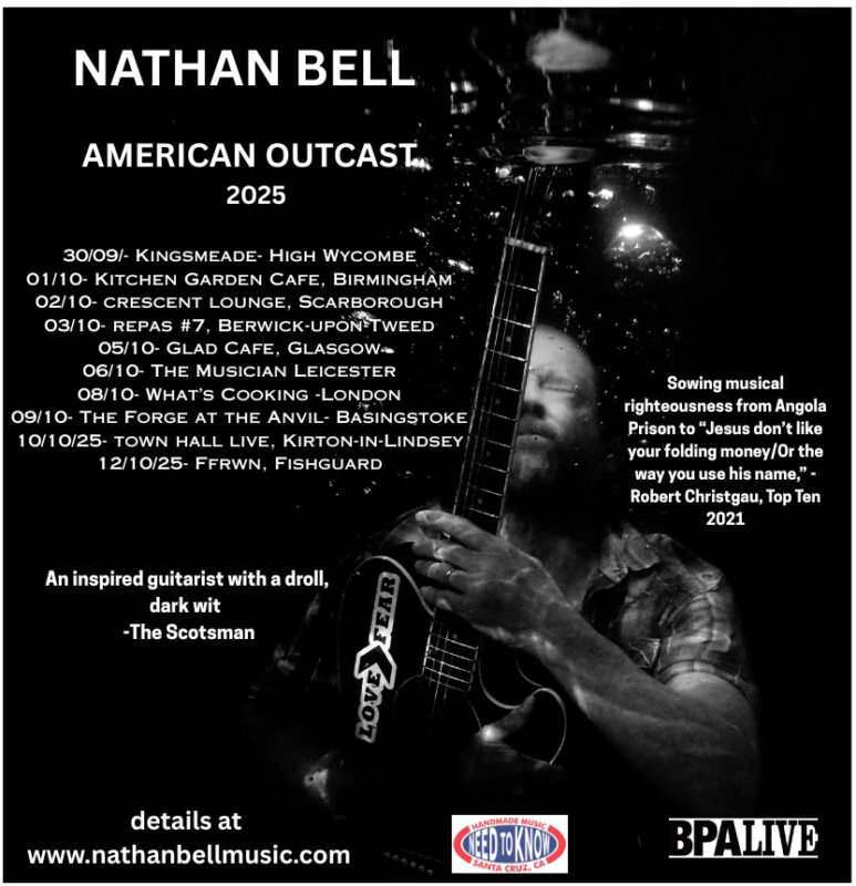 A past winner of the AUK readers’ Poll for Male Performer Of The Year, Nathan Bell has been a firm favourite in roots venues in the UK and in Europe ever since he ventured over here back in 2017. Over the course of a dozen albums, he has staked his claim to be considered a chronicler of the regular “American working man,” via his initial trio of albums, which were based on life, work and family, with Bell working firmly in a blue-collar folk singing tradition. Later albums reflected America’s slide into populist politics and its attendant dangers, culminating in the pointed anger contained in “Red, White And American Blues (It Couldn’t Happen Here)” which raged against the dimming of the day in America.
